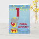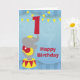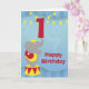 Comemore o primeiro aniversário em estilo com este lindo design de circo com um elefante de desenho animado segurando o número um. O texto pode ser personalizado para sua ocasião especial. Visite CelebratiobBazaar para ver a coleção de presentes, favoritos para festas e artigos de papelaria com este belo design de aniversário.
