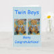 Dois pequenos ursinhos bonitos com arcos azuis sobre fundo gingham e o texto Twin Boys Muitos Parabéns!