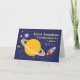 Deseje ao seu neto excelente um feliz aniversário que esteja fora deste mundo! Saturno é visto na cor amarela ouro com estrelas e outros planetas ao seu redor. Um foguete acabou de explodir para desejar feliz aniversário.