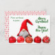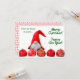 A frente deste cartão de saudação de Natal apresenta uma imagem fofa de um gnomo branco com barba vestindo um chapéu vermelho de Papai Noel que cai sobre seus olhos. Ele está parado atrás de uma fileira de ouro e bolbos de árvore vermelho-claro decorados com prata. O texto verde diz "Feliz Natal!" e "Feliz ano novo!" A parte traseira da placa tem campos de texto adicionais em uma oval que é colocada sobre um plano de fundo nórdico vermelho e branco. Todo o texto, frente e verso, pode ser facilmente personalizado por você.