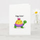 This greeting card features a friendly green turtle-like character centered along the lower half of a white background, smiling with big, gentle eyes that give it an affectionate, companionable look. Its rounded shell is styled like a tiered celebration display, suggesting a sweet shared moment rather than a solo pose. The top tier is sunny yellow with small white dots and tiny pink tulip-shaped flowers, followed by a bright pink middle tier with matching white dots. The bottom tier is purple with neat white ring patterns, and a large fuchsia bow sits on top like a gift-ready accent. Near the top of the card, the words “Happy Easter!” appear in a flowing, casual style in a dark tone, centered above the character. A few spring touches, like 🌷-shaped blossoms on the shell, add a soft seasonal cue, and a small 🐰 or 🐇 emoji would fit naturally beside the greeting. The white space around the turtle keeps the focus on the stacked shell colors and the bright bow, with the pink flowers and white dot details clearly visible.