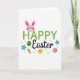 This card features a bright Easter greeting arranged in the center, with a cute round-faced bunny peeking over the first word 🐰. The bunny is soft pink with extra-long ears, rosy cheeks, and a sweet, friendly expression that feels like a warm hello to someone close. The word “HAPPY” sits prominently in lively green letters filled with small white polka dots, giving it a fresh, outdoorsy look. Just beneath it, “Easter” appears in dark, flowing cursive-style lettering that adds a gentle, romantic touch, like a note written with care. Around the text, a tiny yellow chick with wide eyes stands near a striped decorative egg, as if keeping watch beside a friend 🐇. Pastel flowers in blue with a golden center and pink with soft petals sit nearby, along with a small orange carrot and a sky-blue five-point star. Thin green grass blades and a few faint bubble-like circles float against a crisp white background.