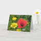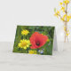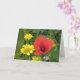 A bright red poppy stands out among the green grass and some pretty yellow flowers