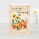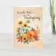 Um design quente de Ação de Graças com abóboras, girassóis e folhas coloridas do outono, perfeito para enviar através das milhas. A saudação frontal faz a ponte, enquanto a dentro continua o tema caloroso da gratidão e dos desejos calorosos de uma bela Ação de Graças. Uma maneira séria de se conectar com entes queridos que podem estar longe neste feriado.