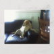o cão sentado num sofá de couro, parecendo que ela realmente é dono do lugar, parecendo um humano!