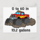 Um desenho animado de um caminhão com pneus grandes rasgando a sujeira. As palavras 0 a 60 em 10,2 galões ao redor dele. Vamos pelo menos tentar conservar nossas reservas de gasolina.