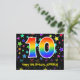 A frente deste emocionante, divertido e colorido design de cartão postal temático de aniversário apresenta um grande número "10" com um padrão inspirado no gradiente do espectro do arco-íris, juntamente com a mensagem "Feliz 10º Aniversário" e um nome de destinatário personalizado. A frente também tem um padrão de fundo de formas de estrelas coloridas e vibrantes. O verso apresenta uma mensagem de saudação de aniversário personalizada ou pode ser limpo e deixado em branco se uma mensagem for escrita à mão. Um cartão postal de aniversário personalizado como este pode ser uma maneira divertida de reconhecer o décimo aniversário de alguém. Cartões postais como este também podem ser usados para convidar convidados para uma festa de aniversário realizada para alguém que está completando 10 anos de idade.