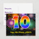 A frente deste design de cartão postal de aniversário colorido, divertido e emocionante apresenta um grande número "10" com um padrão de gradiente de espectro de arco-íris inspirado, juntamente com a mensagem "Feliz Aniversário de 10 anos", e um nome de destinatário personalizado. A frente também apresenta um padrão de fundo colorido e vibrante inspirado na aparência de fogos de artifício comemorativos estourando. A parte traseira apresenta uma mensagem de saudação de aniversário personalizada, ou talvez possa ser limpa e deixada em branco se uma mensagem for escrita à mão. Um cartão postal de aniversário personalizável como este pode ser uma maneira divertida de celebrar o décimo aniversário de alguém. Cartões postais como este também podem ser usados para convidar convidados para uma festa de aniversário realizada para alguém que está completando 10 anos de idade.