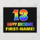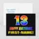 A frente deste design de cartão postal de aniversário colorido, divertido e alegre apresenta um grande número "13" e a mensagem "FELIZ BIRTHDAY", ambos coloridos com um padrão inspirado no gradiente do espectro do arco-íris, juntamente com um nome de destinatário ousado amarelo editável. A frente também apresenta um plano de fundo simples, claro e preto. A parte de trás do cartão postal tem uma mensagem de saudação de aniversário editável, ou talvez pudesse ser apagada e deixada em vazio se uma mensagem fosse escrita manualmente. Um cartão postal animado de aniversário personalizado como este pode ser uma maneira divertida de enviar uma mensagem celebrando o décimo terceiro aniversário de alguém. [~Z0000474]