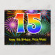 A frente deste design de cartão postal temático de aniversário emocionante, divertido e colorido apresenta um grande número "15" com um padrão de gradiente de espectro de arco-íris. Também apresenta a mensagem "Feliz 15º Aniversário," e um nome de destinatário editável. A frente também apresenta um padrão de fundo colorido e vibrante inspirado na aparência de fogos de artifício comemorativos estourando. O verso apresenta uma mensagem de saudação de aniversário personalizada ou pode ser limpo e deixado em branco se uma mensagem for escrita à mão. Um cartão postal de aniversário personalizado como este pode ser uma maneira divertida de reconhecer o 15º aniversário de alguém. Cartões postais como este também podem ser usados para convidar convidados para uma festa de aniversário realizada para alguém que está completando 15 anos de idade.
