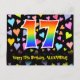 A frente deste design de cartão postal de aniversário amoroso, emocionante e colorido apresenta um grande número "17" com um padrão de gradiente de espectro de arco-íris. Também apresenta a mensagem "Feliz Aniversário de 17 anos," e um nome de destinatário personalizado. A frente também apresenta um padrão de fundo vibrante e colorido com corações amorosos de diferentes tamanhos. A parte de trás apresenta uma mensagem de saudação de aniversário personalizada, ou talvez possa ser limpa e deixada em branco se uma mensagem for escrita à mão. Um cartão postal de aniversário personalizado como este pode ser uma maneira divertida de celebrar o aniversário de dezessete anos de alguém. Cartões postais como este também podem ser usados para convidar convidados para uma celebração de aniversário realizada para alguém que está completando 17 anos de idade.