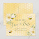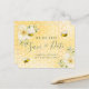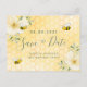 A Save the Date card for a 18th Summer festa de aniversário. Fundo amarelo, branco com um padrão de mel. Decorados com flores tropicais, cor de creme, amarelo-claro, hibisco e abelhas-tronco felizes. Modelos para uma data e nome/idade 18. Letras verdes e cinzas coloridas. O texto: Salvar a Data é gravado com um script de estilo com letra de tendência grande. Dica: Se você não quiser que pareça um cartão postal, clique em personalizar, vá para o verso e remova o divisor e o carimbo de posto.
