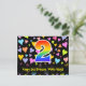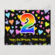 A frente deste divertido, colorido e animado design de cartão postal de aniversário apresenta um grande número "2" com um padrão de gradiente de espectro de arco-íris, juntamente com a mensagem "Feliz 2º Aniversário," e um nome de destinatário personalizado. A frente também apresenta um vibrante e colorido padrão de fundo com formas de coração amorosas. A parte traseira apresenta uma mensagem de saudação de aniversário editável, ou talvez possa ser limpa e deixada em branco se uma mensagem for escrita à mão. Um cartão postal de aniversário personalizado como este pode ser uma maneira divertida de celebrar o segundo aniversário de alguém. Cartões postais como este também podem ser usados para convidar convidados para uma celebração de aniversário realizada para alguém que está completando 2 anos de idade.