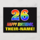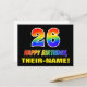 A frente deste design de cartão postal de aniversário divertido, alegre e colorido apresenta um grande número "26" e a mensagem "FELIZ BIRTHDAY", ambos coloridos com um padrão inspirado no gradiente do espectro do arco-íris, juntamente com um nome ousado de destinatário personalizado amarelo. A frente também tem um fundo preto, claro e mínimo. A parte de trás do cartão postal contém uma mensagem de saudação de aniversário personalizável, ou talvez possa ser apagada e deixada em vazio se uma mensagem for escrita manualmente. Um cartão de aniversário personalizável e alegre como este pode ser uma forma divertida de celebrar o vigésimo sexto aniversário de alguém. [~Z0000474]