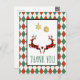 Um cartão postal de Natal que diz "Obrigado" na frente e tem uma mensagem personalizada no verso. Projetado com uma ilustração de 2 veados de Natal saltando. Os veados são feitos de xadrez de lenhador vermelho e preto, com um pequeno coração entre eles. Decorações de Natal com brilho dourado falso pendem do topo. O fundo é um padrão de argila vermelha e verde.