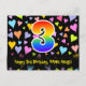 A frente deste emocionante, divertido e colorido design de cartão postal temático de aniversário apresenta um grande número "3" com um padrão inspirado no gradiente do espectro do arco-íris, juntamente com a mensagem "Feliz 3º Aniversário" e um nome de destinatário personalizado. A frente também apresenta um padrão de fundo vibrante e colorido com corações amorosos de diferentes tamanhos. O verso apresenta uma mensagem de aniversário personalizada, ou talvez possa ser limpo e deixado em branco se uma mensagem for escrita à mão. Um cartão postal de aniversário personalizável como este pode ser uma maneira divertida de reconhecer o terceiro aniversário de alguém. Cartões postais como este também podem ser usados para convidar convidados para uma celebração de aniversário de alguém que está completando 3 anos de idade.