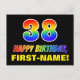 A frente deste design de cartão postal colorido, alegre e divertido aniversário com tema de aniversário apresenta um grande número "38" e a mensagem "FELIZ BIRTHDAY", ambas coloridas com um padrão inspirado no gradiente do espectro do arco-íris, juntamente com um nome ousado de destinatário personalizado amarelo. A frente também tem um fundo simples, minimalista e preto. A parte de trás do cartão postal tem uma mensagem de saudação de aniversário personalizável, ou talvez pudesse ser apagada e deixada a vazio se uma mensagem fosse escrita manualmente. Um interessante e personalizável cartão postal de aniversário como este pode ser uma maneira divertida de enviar uma mensagem em comemoração dos trinta e oito anos de alguém. [~Z0000474]
