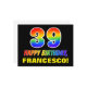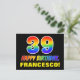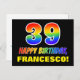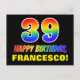 A frente deste design de cartão de aniversário alegre, divertido e colorido apresenta um grande número "39" e a mensagem "FELIZ BIRTHDAY", ambos tendo um gradiente de espectro do arco-íris inspirado na coloração de padrões, juntamente com um nome de destinatário personalizável amarelo ousado. A frente também apresenta um fundo simples, minimalista e preto. A parte de trás do cartão postal tem uma mensagem de saudação de aniversário personalizável, ou talvez pudesse ser apagada e deixada a vazio se uma mensagem fosse escrita manualmente. Um postal de aniversário personalizado e colorido como este pode ser uma maneira divertida de reconhecer o trigésimo nono aniversário de alguém. [~Z0000474]