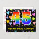 A frente deste emocionante, carinhoso e colorido design de cartão postal temático de aniversário apresenta um grande número "45" com um padrão inspirado no gradiente do espectro do arco-íris, juntamente com a mensagem "Feliz Aniversário de 45 anos" e um nome de destinatário personalizável. A frente também tem um vibrante e colorido padrão de fundo com formas de coração carinhosas. O verso apresenta uma mensagem de aniversário personalizável, ou talvez possa ser limpo e deixado em branco se uma mensagem for escrita à mão. Um cartão postal de aniversário personalizável como este pode ser uma maneira divertida de reconhecer o aniversário de alguém de 45 anos. Cartões postais como este também podem ser usados para convidar convidados para uma festa de aniversário realizada para alguém que está completando 45 anos de idade.