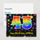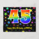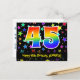 A frente deste design de cartão postal de aniversário colorido, divertido e emocionante apresenta um grande número "45" com um padrão de gradiente de espectro de arco-íris. Também apresenta a mensagem "Feliz Aniversário de 45 anos," e um nome de destinatário personalizado. A frente também apresenta um padrão de fundo colorido e vibrante com formas de estrelas de diferentes tamanhos. A parte traseira apresenta uma mensagem de saudação de aniversário personalizada, ou talvez possa ser limpa e deixada em branco se uma mensagem for escrita à mão. Um cartão postal de aniversário personalizável como este pode ser uma maneira divertida de celebrar o aniversário de alguém de quarenta e cinco anos. Cartões postais como este também podem ser usados para convidar convidados para uma festa de aniversário ou celebração que será realizada para alguém que está completando 45 anos de idade.