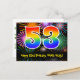 A frente deste divertido, colorido e animado design de cartão postal temático de aniversário apresenta um grande número "53" com um padrão de gradiente de espectro de arco-íris, juntamente com a mensagem "Feliz Aniversário de 53 anos", e um nome de destinatário personalizado. A frente também apresenta um padrão de fundo vibrante e colorido inspirado na aparência de fogos de artifício comemorativos estourando. O verso apresenta uma mensagem de saudação de aniversário editável, ou talvez possa ser limpo e deixado em branco se uma mensagem for escrita à mão. Um cartão postal de aniversário como este pode ser uma maneira divertida de enviar desejos de aniversário para alguém que está celebrando seu aniversário de 53 anos. Cartões postais como este também podem ser usados para convidar convidados para uma festa de aniversário realizada para alguém que está completando 53 anos. [~Z000