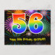 A frente deste emocionante, colorido e divertido design de cartão postal temático de aniversário apresenta um grande número "56" com um padrão inspirado em gradiente de espectro de arco-íris. Também apresenta a mensagem "Feliz Aniversário de 56 anos," e um nome de destinatário personalizável. A frente também tem um padrão de fundo vibrante e colorido inspirado em fogos de artifício comemorativos. A parte traseira apresenta uma mensagem de saudação de aniversário personalizável, ou talvez possa ser limpada e deixada em branco se uma mensagem for escrita à mão. Um cartão postal de aniversário personalizado como este pode ser uma maneira divertida de celebrar o aniversário de cinquenta e seis anos de alguém. Cartões postais como este também podem ser usados para convidar convidados para uma festa de aniversário ou celebração que será realizada para alguém que está completando 56 anos de idade. [~