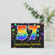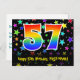 A frente deste divertido, colorido e animado design de cartão postal temático de aniversário apresenta um grande número "57" com um padrão inspirado em gradiente de espectro de arco-íris, juntamente com a mensagem "Feliz Aniversário de 57 anos", e um nome de destinatário personalizado. A frente também apresenta um fundo vibrante e colorido com um padrão de formas de estrelas. A parte traseira apresenta uma mensagem de saudação de aniversário personalizável, ou talvez possa ser limpada e deixada em branco se uma mensagem for escrita à mão. Um cartão postal de aniversário personalizável como este pode ser uma maneira divertida de reconhecer o aniversário de cinquenta e sete anos de alguém. Cartões postais como este também podem ser usados para convidar convidados para uma festa de aniversário ou celebração que será realizada para alguém que está completando 57 anos de idade.