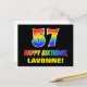 A frente desta divertida, alegre e colorida design de cartão postal com tema de aniversário apresenta um grande número "57" e a mensagem "FELIZ BIRTHDAY", ambos tendo um gradiente de padrão inspirado no espectro do arco-íris, juntamente com um nome ousado de destinatário personalizado amarelo. A frente também apresenta um simples fundo preto. A parte de trás do cartão postal contém uma mensagem de saudação de aniversário personalizável, ou talvez possa ser apagada e deixada em vazio se uma mensagem for escrita manualmente. Um cartão postal de aniversário vibrante e personalizável como este pode ser uma maneira divertida de reconhecer os cinquenta e sete anos de alguém. [~Z0000474]