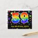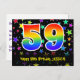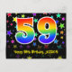 A frente deste emocionante, colorido e divertido design de cartão postal temático de aniversário apresenta um grande número "59" com um padrão inspirado no gradiente do espectro do arco-íris, juntamente com a mensagem "Feliz Aniversário de 59 anos", e um nome de destinatário personalizável. A frente também apresenta um padrão de fundo de formas de estrelas coloridas e vibrantes. O verso apresenta uma mensagem de aniversário personalizada, ou talvez possa ser limpo e deixado em branco se uma mensagem for escrita à mão. Um cartão postal de aniversário personalizado como este pode ser uma maneira divertida de celebrar o aniversário de cinquenta e nove anos de alguém. Cartões postais como este também podem ser usados para convidar convidados para uma festa de aniversário ou celebração que será realizada para alguém que está completando 59 anos de idade.