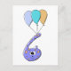 Um desenho de um monstro em forma de um número 6. Projetado para um 6 de aniversário infantil. Este personagem de aniversário número 6 está em roxo com pontos laranja claros e três balões coloridos.