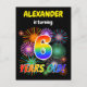A frente desta design de cartão postal animada e animada convite de aniversário tem um nome personalizável, um padrão inspirado em fogos de artifício celebratórios vibrantes, e a mensagem "6 ANOS DE IDADE!" tendo um espectro colorido do arco-íris inspirou um padrão de gradiente. O verso apresenta uma mensagem personalizável que pode descrever quando e onde a parte está sendo mantida, além de outras informações relevantes. Cartões-postais como este podem ser enviados a potenciais participantes de uma festa de aniversário que se realiza em comemoração do sexto aniversário de alguém. [~Z0000452]