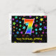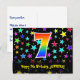 A frente deste divertido, colorido e animado design de cartão postal de aniversário apresenta um grande número "7" com um padrão de gradiente de espectro de arco-íris, juntamente com a mensagem "Feliz Aniversário de 7 anos", e um nome de destinatário personalizado. A frente também apresenta um padrão vibrante e colorido de formas de estrelas. O verso apresenta uma mensagem de saudação de aniversário personalizada, ou talvez possa ser limpo e deixado em branco se uma mensagem for escrita à mão. Um cartão postal de aniversário personalizável como este pode ser uma maneira divertida de enviar uma mensagem celebrando o sétimo aniversário de alguém. Cartões postais como este também podem ser usados para convidar convidados para uma celebração de aniversário realizada para alguém que está completando 7 anos de idade.