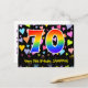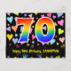 A frente deste cartão postal temático de aniversário, colorido e divertido, apresenta um grande número "70" com um padrão de gradiente de espectro de arco-íris. Também apresenta a mensagem "Feliz Aniversário de 70 anos," e um nome de destinatário personalizado. A frente também tem um padrão de fundo de corações amorosos vibrantes e coloridos. O verso apresenta uma mensagem de aniversário personalizada, ou pode ser limpo e deixado em branco se uma mensagem for escrita à mão. Um cartão postal de aniversário personalizado como este pode ser uma maneira divertida de enviar uma mensagem celebrando o aniversário de setenta anos de alguém. Cartões postais como este também podem ser usados para convidar convidados para uma celebração de aniversário realizada para alguém que está completando 70 anos de idade.