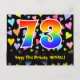 A frente deste emocionante, divertido e colorido design de cartão postal de aniversário apresenta um grande número "73" com um padrão de gradiente de espectro de arco-íris, juntamente com a mensagem "Feliz Aniversário de 73 anos," e um nome de destinatário personalizado. A frente também apresenta um padrão de fundo colorido e vibrante com formas de coração amorosas de diferentes tamanhos. A parte traseira apresenta uma mensagem de saudação de aniversário personalizada, ou talvez possa ser limpada e deixada em branco se uma mensagem for escrita à mão. Um cartão postal de aniversário personalizado como este pode ser uma maneira divertida de reconhecer o aniversário de setenta e três anos de alguém. Cartões postais como este também podem ser usados para convidar convidados para uma festa de aniversário realizada para alguém que está completando 73 anos de idade.