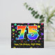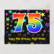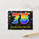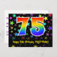 A frente deste design de cartão postal temático de aniversário emocionante, colorido e divertido apresenta um grande número "75" com um padrão inspirado em gradiente de espectro de arco-íris. Também apresenta a mensagem "Feliz Aniversário de 75 anos" e um nome de destinatário personalizado. A frente também apresenta um fundo colorido e vibrante com um padrão de formas de estrelas. A parte traseira apresenta uma mensagem de saudação de aniversário personalizável ou pode ser limpada e deixada em branco se uma mensagem for escrita à mão. Um cartão postal de aniversário personalizável como este pode ser uma maneira divertida de reconhecer o aniversário de setenta e cinco anos de alguém. Cartões postais como este também podem ser usados para convidar convidados para uma festa de aniversário ou celebração que será realizada para alguém que está completando 75 anos de idade.