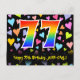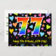 A frente deste design de cartão postal de aniversário amoroso, divertido e emocionante apresenta um grande número "77" com um padrão inspirado em gradiente de espectro de arco-íris, juntamente com a mensagem "Feliz Aniversário de 77 anos", e um nome de destinatário personalizável. A frente também tem um fundo vibrante e colorido com um padrão de corações amorosos. A parte traseira apresenta uma mensagem de saudação de aniversário personalizada, ou talvez possa ser limpada e deixada em branco se uma mensagem for escrita à mão. Um cartão postal de aniversário personalizado como este pode ser uma maneira divertida de enviar uma mensagem em celebração do septuagésimo sétimo aniversário de alguém. Cartões postais como este também podem ser usados para convidar convidados para uma festa de aniversário realizada para alguém que está completando 77 anos de idade.