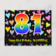 A frente deste design de cartão postal colorido, divertido e carinhoso de tema de aniversário apresenta um grande número "81" com um padrão inspirado em gradiente de espectro de arco-íris, junto com a mensagem "Feliz 81º Aniversário," e um nome de destinatário personalizável. A frente também tem um padrão vibrante e colorido de formas de coração carinhoso. O verso apresenta uma mensagem de saudação de aniversário personalizada, ou talvez possa ser limpo e deixado em branco se uma mensagem for escrita à mão. Um cartão postal de aniversário personalizado como este pode ser uma maneira divertida de enviar uma mensagem em celebração do 81º aniversário de alguém. Cartões postais como este também podem ser usados para convidar convidados para uma festa de aniversário realizada para alguém que está completando 81 anos de idade.