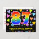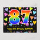 A frente deste divertido, colorido e emocionante design de cartão postal temático de aniversário apresenta um grande número "87" com um padrão inspirado em gradiente de espectro de arco-íris. Também apresenta a mensagem "Feliz Aniversário de 87 anos," e um nome de destinatário personalizado. A frente também tem um padrão colorido e vibrante de corações amorosos. A parte traseira apresenta uma mensagem de saudação de aniversário editável, ou talvez possa ser limpa e deixada em branco se uma mensagem for escrita à mão. Um cartão postal de aniversário personalizado como este pode ser uma maneira divertida de enviar uma mensagem em celebração do aniversário de oitenta e sete anos de alguém. Cartões postais como este também podem ser usados para convidar convidados para uma festa de aniversário ou celebração que está sendo realizada para alguém que está completando 87 anos de idade.