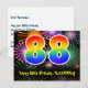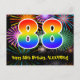 A frente deste divertido, emocionante e colorido design de cartão postal de aniversário apresenta um grande número "88" com um padrão de gradiente de espectro de arco-íris inspirado, juntamente com a mensagem "Feliz Aniversário de 88 anos", e um nome de destinatário personalizado. A frente também apresenta um padrão de fundo colorido e vibrante inspirado em fogos de artifício comemorativos. O verso apresenta uma mensagem de saudação de aniversário editável, ou pode ser limpo e deixado em branco se uma mensagem for escrita à mão. Um cartão postal de aniversário personalizável como este pode ser uma maneira divertida de enviar uma mensagem em celebração do octogésimo oitavo aniversário de alguém. Cartões postais como este também podem ser usados para convidar convidados para uma festa de aniversário ou celebração que está sendo realizada para alguém que está completando 88 anos de idade.