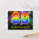 A frente deste emocionante, divertido e colorido design de cartão postal temático de aniversário apresenta um grande número "89" com um padrão inspirado no gradiente do espectro do arco-íris, juntamente com a mensagem "Feliz Aniversário de 89 anos", e um nome de destinatário editável. A frente também tem um padrão de fundo colorido e vibrante inspirado na aparência de fogos de artifício comemorativos estourando. O verso apresenta uma mensagem de saudação de aniversário personalizada, ou talvez possa ser limpo e deixado em branco se uma mensagem for escrita à mão. Um cartão postal de aniversário como este pode ser uma maneira divertida de enviar desejos de aniversário para alguém que está celebrando seu octogésimo nono aniversário. Cartões postais como este também podem ser usados para convidar convidados para uma festa de aniversário ou celebração sendo realizada para alguém que está completando