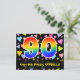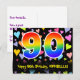 A frente deste design de cartão-postal colorido, divertido e comemorativo de aniversário apresenta um grande número "90" com um padrão de gradiente de espectro de arco-íris. Também apresenta a mensagem "Feliz 90º Aniversário," e um nome de destinatário personalizado. A frente também tem um padrão de fundo de corações amorosos vibrantes e coloridos. A parte traseira apresenta uma mensagem de saudação de aniversário personalizável ou pode ser limpada e deixada em branco se uma mensagem for escrita à mão. Um cartão-postal de aniversário personalizável como este pode ser uma maneira divertida de enviar uma mensagem comemorando o aniversário de noventa anos de alguém. Cartões-postais como este também podem ser usados para convidar convidados para uma celebração de aniversário ou festa sendo realizada para alguém que está completando 90 anos de idade.