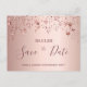 Uma cinta e uma moda Salve a placa Date para uma festa de aniversário 90. Um fundo branco, cor-de-rosa feminino, rosa dourado falso, metálico, decorado com estrelas de ouro rosa. Modelos para uma data e nome/idade 90. Letras rosa escuras de cor dourada. O texto: Salvar a Data é gravado com um script de estilo com letra de tendência grande. Dica: Se você não quiser que pareça um cartão postal, clique em personalizar, vá para o verso e remova o divisor e o carimbo de posto.