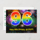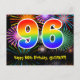 A frente deste divertido, emocionante e colorido design de cartão postal de aniversário apresenta um grande número "96" com um padrão de gradiente de espectro de arco-íris. Também apresenta a mensagem "Feliz Aniversário de 96 anos", e um nome de destinatário personalizável. A frente também tem um padrão de fundo vibrante e colorido inspirado na aparência de fogos de artifício comemorativos estourando. A parte traseira apresenta uma mensagem de saudação de aniversário editável, ou talvez possa ser limpa e deixada em branco se uma mensagem for escrita à mão. Um cartão postal de aniversário personalizado como este pode ser uma maneira divertida de reconhecer o aniversário de alguém de 96 anos. Cartões postais como este também podem ser usados para convidar convidados para uma festa de aniversário realizada para alguém que está completando 96 anos de idade.