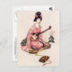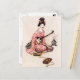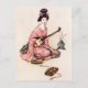 Ilustração de Vintage de "A Bela Dançarina de Yedo" de "Green Willow e outras Conversas de Fadas Japonesas" por Grace James. Ela está vestida com um quimono cor-de-rosa bonito, e ela está ajoelhada e tocando um instrumento musical, o shamisen, com um bachi. Ilustração de Warwick Goble.