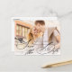 Esta gravação bonito do cartão-postal apresenta um roteiro romântico e uma grande foto. Na frente do cartão postal, a elegante caligrafia que diz "Salvar a Data" é escrita a preto e sobrepõe uma foto de orientação paisagística. Os nomes dos casais, a data do casamento e a localização do casamento também estão escritos em preto. Adicione detalhes adicionais (como um site de casamento) na parte traseira do cartão-postal.