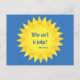 Este postal apresenta uma citação do Papa Francisco dentro de um sol amarelo sobre um fundo azul. As cores fazem parte da Casaco de Braços do Pontiff. O texto diz: Quem sou eu para julgar? É um exemplo da grandeza e humildade deste homem muito especial.