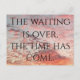 Este é o cartão-postal perfeito para enviar a alguém que está esperando por algo há muito tempo... Diz: "A ESPERA ACABOU. O TEMPO CHEGOU." impresso em letras grandes num lindo fundo cor-de-rosa.