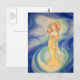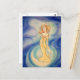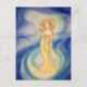 Uma mulher com cabelos ondulados, ouros e um vestido pálido e brilhante com um broche em forma de sol se mantém em plena tranquilidade sobre uma lua crescente no céu azul escuro e giro. Ela está vestida de amarelo pálido com uma aura amarela pálida, girando ligeiramente ao redor com pincéis parelhados com tons de azul escuro no fundo. Uma pintura de aquarela e caneta de tinta, baseada na passagem bíblica sobre a mulher vestida com o sol, a lua sob seus pés, e coroada com estrelas de telve