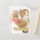 Uma garotinha escreve uma carta usando uma caneta. Um arranjo de tulipas fica na mesa perto. Personalize o texto de acordo com as suas necessidades.
