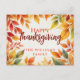 Este cartão postal de Ação de Graças é ideal para espalhar alegria de férias por causa do seu design acolhedor e acolhedor. A delicada matiz texturizada do fundo, que é evocativa do pergaminho da safra, cria uma atmosfera sofisticada e clássica. Folhas ricas de outono, vermelhas, laranja, amarelas e marrons, com tons verdes esmaecidos, enfeitam as bordas. Com suas evidentes veias e gradientes, essas folhas finamente detalhadas têm uma aparência realista. Você pode mudar o texto para seu gosto. Este cartão postal é uma opção excelente para qualquer pessoa que deseje enviar saudações personalizadas durante a temporada de Ação de Graças porque tem uma fronteira folha sazonal e texto personalizável. Sua design capta perfeitamente o espírito de outono e oferece a plataforma ideal para expressar orgulho na família e gratidão.